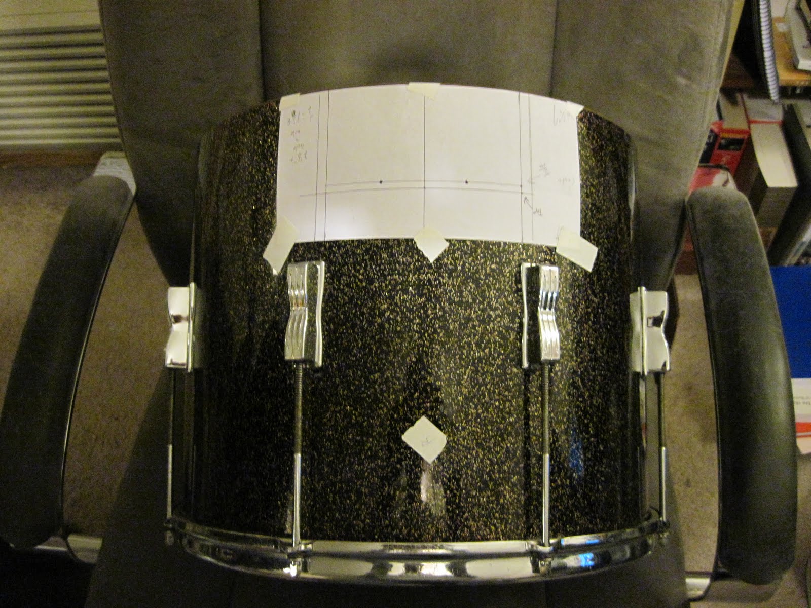 I bought some black Ludwig Rocker drum heads on ebay ($22), and a P85 throw ($24) and a P32 Butt ($6) and converted this tom shell I picked up for $60. I made some templates for the drill markers, taped them on, and drilled baby drilled. I had an extra muffle laying around and added that too (there were holes pre drilled for this, on the same segment as the Ludwig Badge. It appears that the strainer placement isn't how Ludwig did it (they off set the throw one segment from the Badge I do believe.